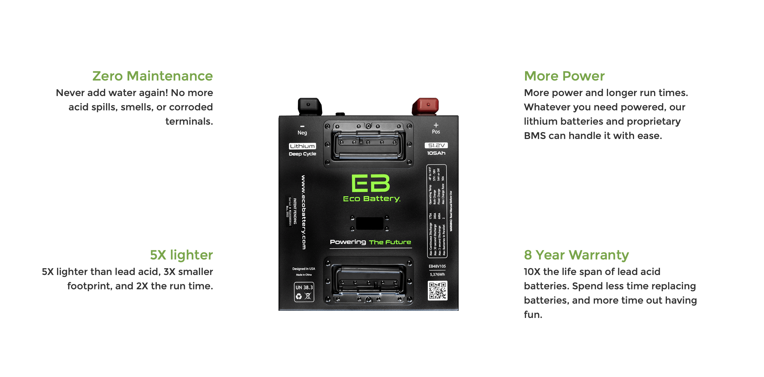 Take advantage of the new Eco Battery high-performance lithium golf cart battery for a dependable, hassle-free, and more potent ride. Your golf cart will include a high-performance lithium battery that offers up to three times faster charging times, more power, no maintenance, and simple installation.